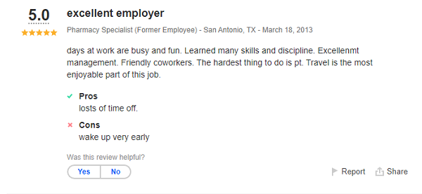 The positive reviews note time off, benefits and learning the responsibilities of the Pharmacist.