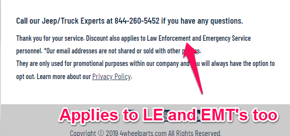 4 Wheel Parts also mentions that law enforcement and emergency service personnel can claim the discount.