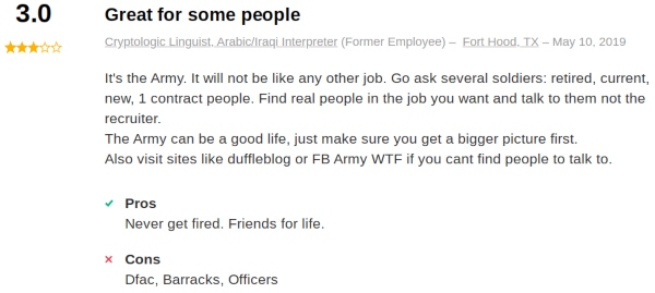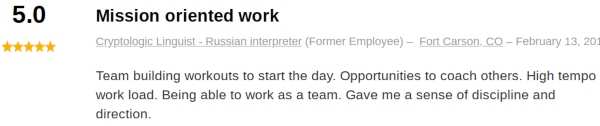 There are some very good job reviews about working as an Army Signals Intelligence Voice Interceptor (MOS 35P) on Indeed.com.