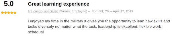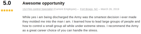 The reviews on Indeed.com for Army Fire Control Specialist (MOS 13J) are dependably positive.