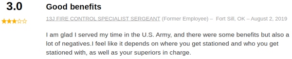 One reviewer did mention that your overall satisfaction or dissatisfaction with the Army and MOS 13J can depend on your superiors as well as where you are stationed: