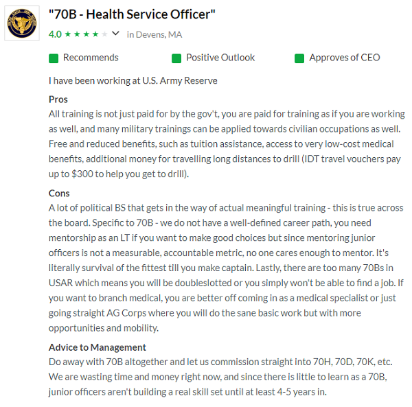 Job reviews for 70B MOS score highest with pay and benefits as well as job security and advancement.