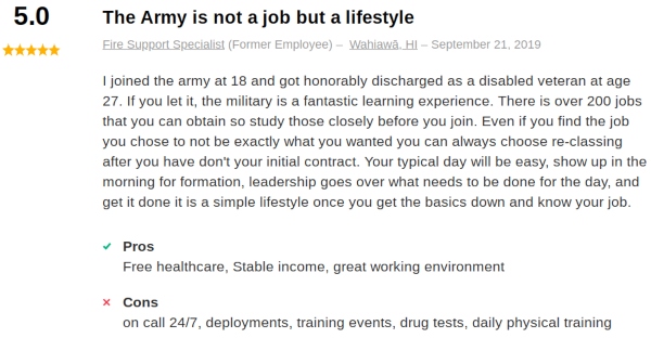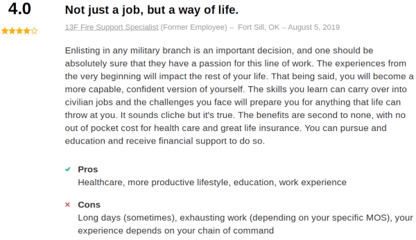 The job reviews on Indeed.com and GlassDoor.com are largely positive related to Army Joint Fire Support Specialist (MOS 13F).