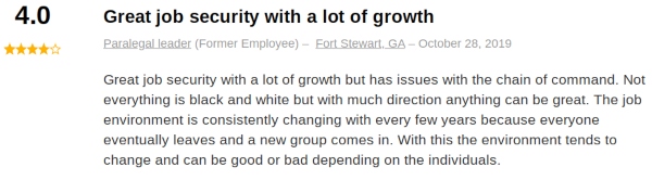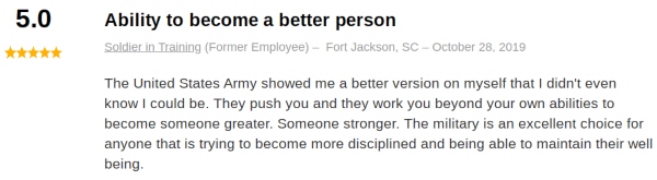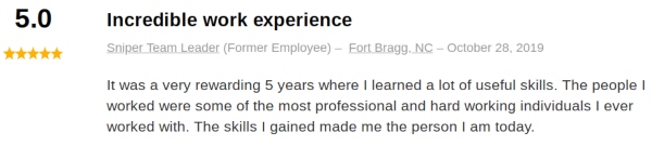 However, you can find a number of reviews about working in the Army in general on Indeed.com.
