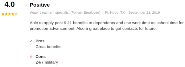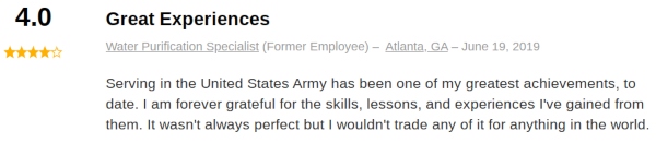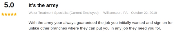 There are a number of positive job reviews on Indeed.com for an Army Water Treatment Specialist (MOS 92W).