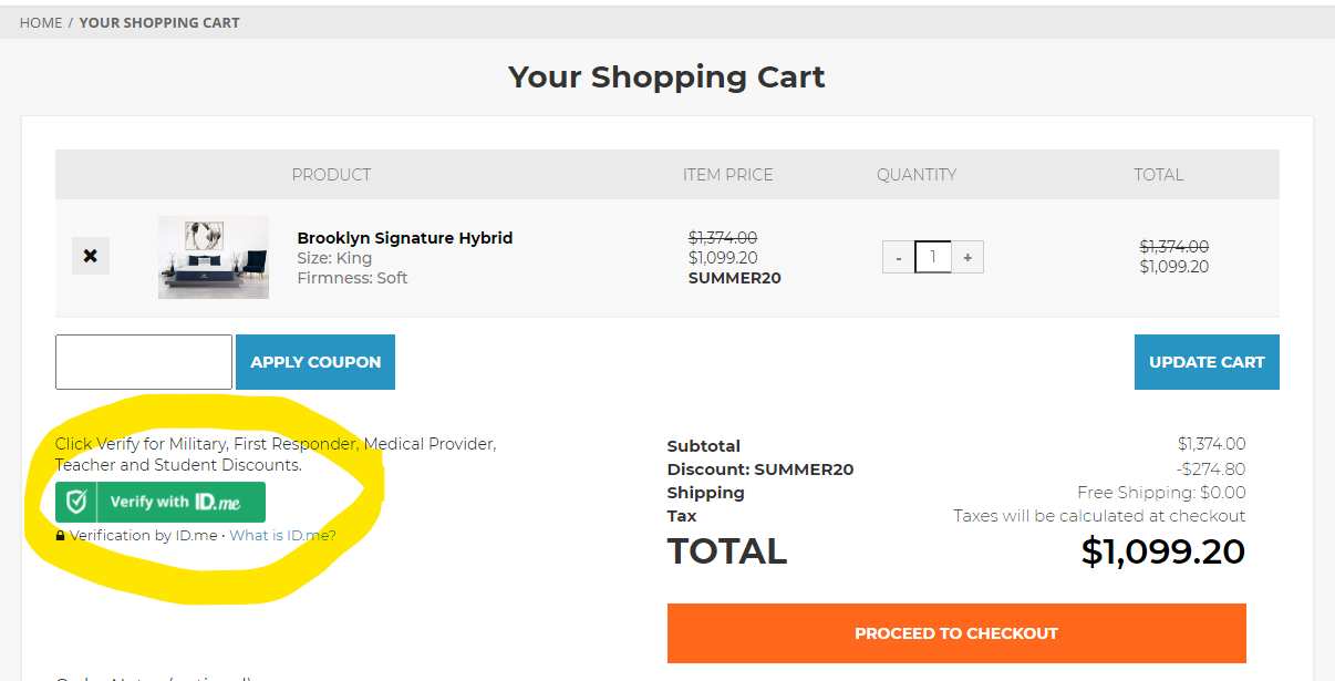 Step 6: Copy and paste your discount code for the Brooklyn Bedding military discount and enter it into the space that says ‘Apply Coupon.’