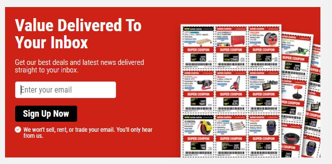 If you type your email address into the box, you will get coupons and other deals from Harbor Freight sent straight to your inbox.