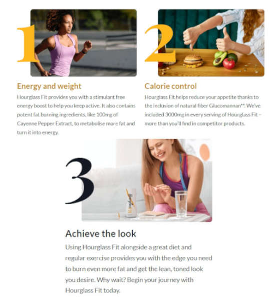 Hourglass Fit is carefully crafted to help support weight loss and general health with a special blend of natural ingredients that bring benefits beyond simple reductions in fat, by addressing specific aspects of wellness that provide a positive impact on the overall weight management journey.