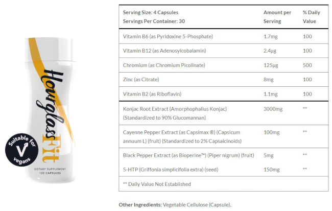 The Hourglass Fit formula includes a blend of vitamins, minerals, and extracts such as Glucomannan, 5-HTP, Capsimax, and Bioperine, with each one contributing uniquely to the overall effectiveness of the formula.