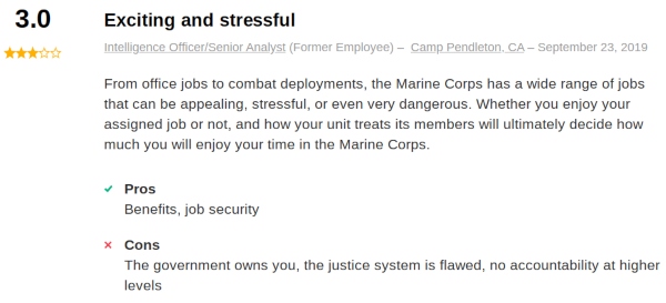 However, you can find some relevant job reviews about Marine Corps Intelligence MOS as a whole through Indeed.com.