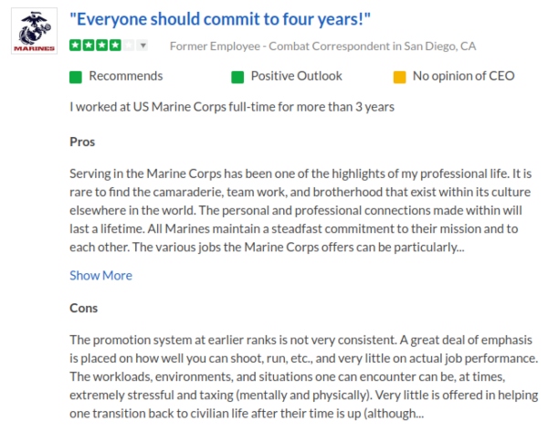 There are a handful of relevant job reviews for Marine Corps Combat Correspondent (MOS 4341) on GlassDoor.com: