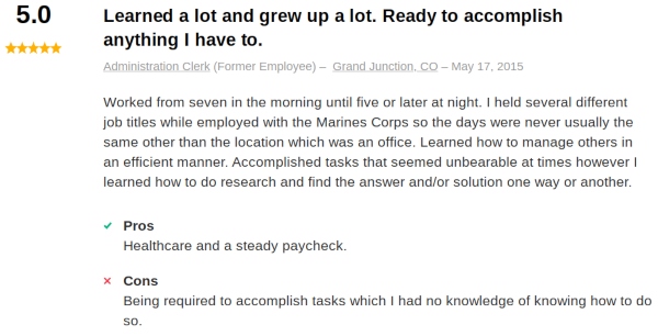You can learn more about what it is like to serve the U.S. Marine Corps in general on Indeed.com: