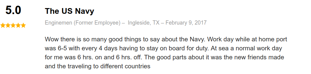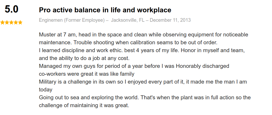 Here are a few reviews we happened across on indeed.com from ex- and current Navy ENs: