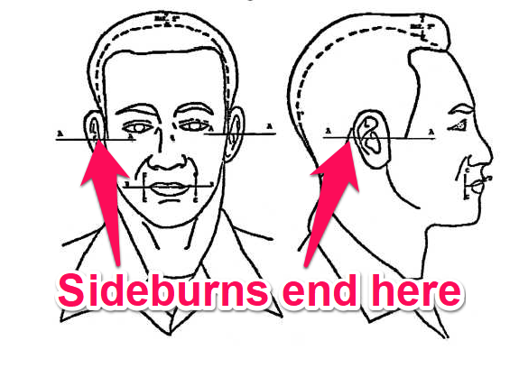Sideburns must also remain even in width and must end with a clean-shaven horizontal trim.