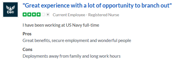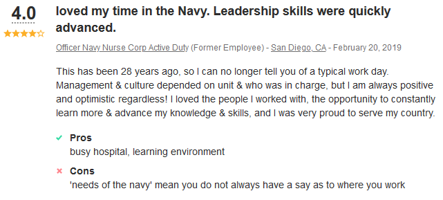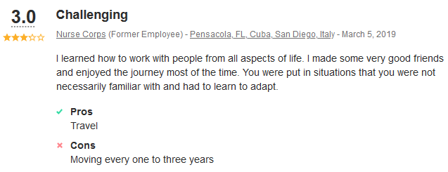 There are a plethora of job reviews available on GlassDoor and Indeed from existing members of the Navy Nurse Corps.