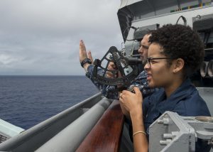 Photo shown with caption: QM1 Clarence Ilijic, left, teaches QMSN Eden Boyd how to operate a sextant on the USS Rushmore (LSD 47). The device the QMSN is holding in the photo is a ‘Brandon type stadimeter’ not a marine sextant. A stadimeter is used to measure the distance to an object of a known height.