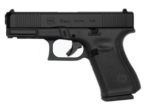 The Glock 19 features a polymer-framed design and weighs less than 24 ounces with an empty magazine.