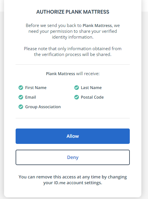Also, if you already have your account, log in. ID.me will ask you for permission to give some information to Plank mattress.