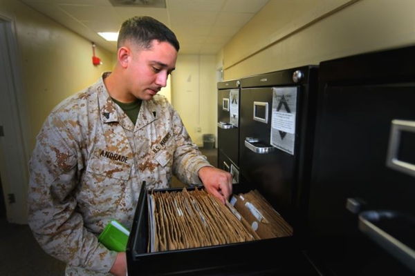 Marine Corps Administrative Specialists (MOS 0111) work in an office setting performing clerical, personnel, and administrative duties.