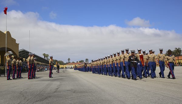 Marines march across the parade deck during a graduation ceremony at Marine Corps Recruit Depot