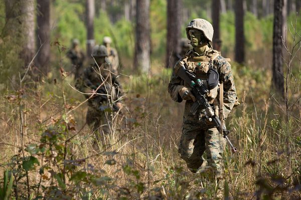 Marines from Delta Company, Infantry Training Battalion, School of Infantry East on patrol